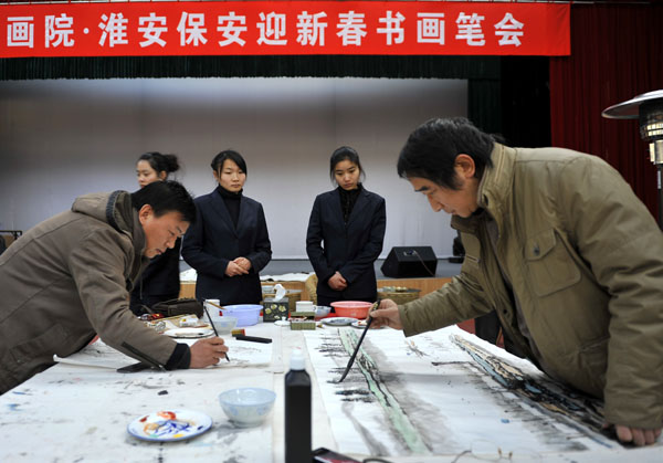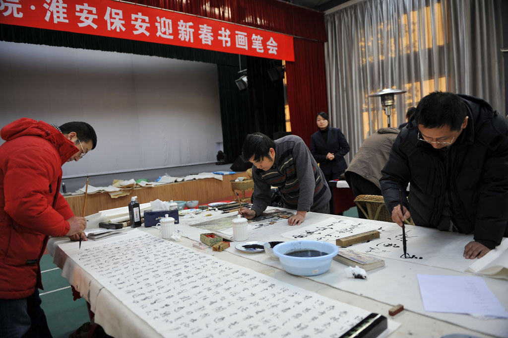元月16日下午,由淮安書畫院和總公司聯合舉辦的“迎新春書畫筆會”活動在公司活動中心舉行。公司總經理婁伯翱、副總經理王克、徐文剛和各部門負責人蒞臨活動現場,部分保安隊伍和押運隊伍中的書畫愛好者到現場觀摩學習。會上,書畫們齊集一堂,創作了一幅幅書畫精品,彰顯了保安文化特色,贏得了在場觀摩者們的贊賞與好評。