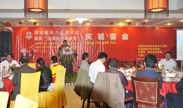 2011年9月29日晚,總公司在天地緣大酒店隆重舉行“萬成明同志榮獲第三屆全國先進保安員稱號慶祝宴會”。宴會之前,王克副總經理宣讀了總公司對萬成明同志的表彰決定,徐文剛副總經理為萬成明同志頒發了獎金,同時,萬成明發表了獲獎感言。