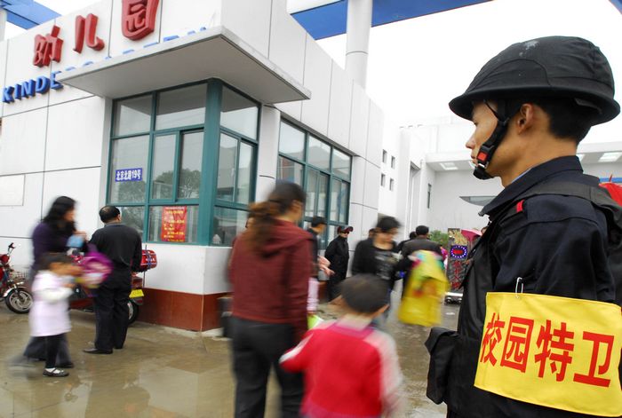 全副武裝的校園特衛人員整裝待發。自當日起,江蘇省淮安市首批