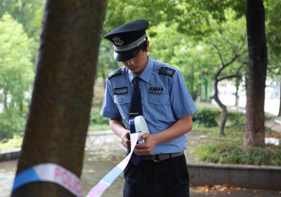 圖為:比賽結束后,保安隊員收回警戒線,保持通暢