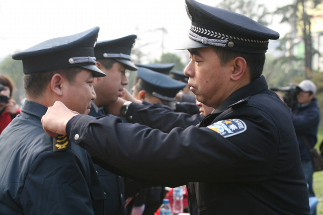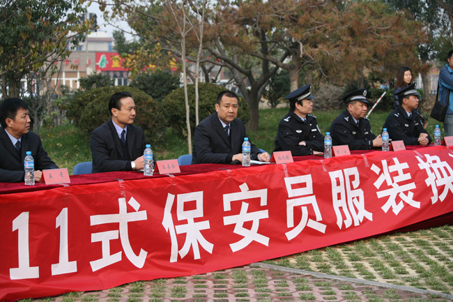11月22日上午9點(diǎn)30分,公司保安員換新裝儀式在龍都廣場舉行,儀式現(xiàn)場,首批100余名保安員穿上了2011式服裝。公司領(lǐng)導(dǎo)及天橋分局治安大隊(duì)保安管理科領(lǐng)導(dǎo)為保安員授銜。隨后,全體身著新式保安制服的保安員進(jìn)行了隊(duì)列演練;最后,公司領(lǐng)導(dǎo)強(qiáng)調(diào):在換裝后保安隊(duì)伍將按照公安部要求,加強(qiáng)保安隊(duì)伍建設(shè),努力建設(shè)一支素質(zhì)過硬、形象良好、服務(wù)規(guī)范、群眾滿意的保安隊(duì)伍,也希望我們?nèi)w保安員要以這次換裝為契機(jī),進(jìn)一步增強(qiáng)榮譽(yù)感、責(zé)任感和使命感,外樹形象、內(nèi)增素質(zhì),推動(dòng)安保工作再上新臺(tái)階。在社會(huì)治安工作中發(fā)揮重要作用。