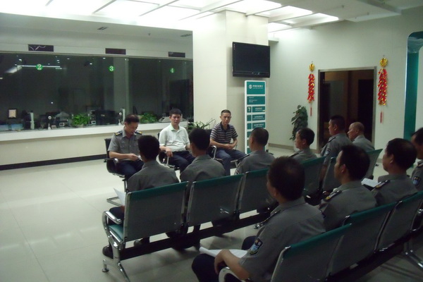(上圖)為了組織好此次專項銀行突發事件應急演練的消防安全演練,黃瑞明科長和林銘春中隊長以實例向保安員講解應對犯罪嫌疑犯人在營業廳實施搶劫暴力侵害時,要以“平息事態、控制局面、防止擴大散、減少損失”為主要原則,針對不同情況采取制止、保護、求援、疏散等方法,確保銀行營業場所的安全,并對消防安全“四個能力”建設、火災基礎知識、高層建筑逃生自救、辦公樓常用消防設施的檢查、使用等多個方面進行對保安員詳細講解培訓。