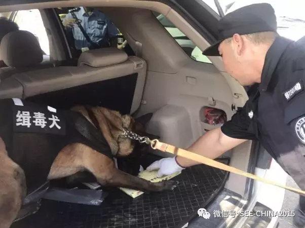 檢查中,訓導員攜緝毒犬配合巡邏民警在岱山檢測站對過往車輛逐一排查。排查時,緝毒犬“大奔”在一輛白色越野車后備箱發現可疑物,立即臥下示警,現場民警果斷對嫌疑人及車輛進行控制,并迅速帶離現場進行盤查,整個排查工作有序進行。