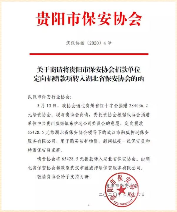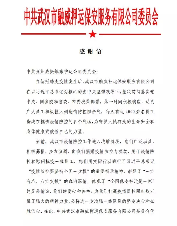 近日,貴州威振鎮東護運公司黨委動員組織廣大員工,積極為我公司募捐愛心捐款,用于疫情防控和慰問抗疫一線員工,并經多方協調,將捐贈專項款項送達到我公司。在武漢市疫情防控工作進入決勝階段,貴州威振鎮東護衛公司的愛心,為我們打贏疫情防控阻擊戰匯聚了強大的精神力量,必將進一步增強一線隊員的堅定決心和必勝信心。武漢市融威押運公司黨委及全體員工對貴州威振鎮東護運公司黨委和全體員工,以及提供協調支持的貴陽市保安協會、湖北省保安協會和武漢市保安協會等機構,表示誠摯的感謝和崇高的敬意!
