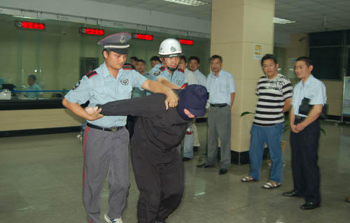 7月23日上午6時許,市區一家銀行營業大廳內,兩名手持炸藥包的“歹徒”突襲銀行工作人員并索要錢物,銀行保安與之發生了激烈搏斗,瞬間“歹徒”被勇敢的保安員“擒獲”。當日,江蘇銀行淮安支行與市保安公司開展的多課目反搶劫演練,進一步提高了保安員處置突發事件的能力。