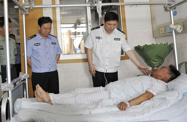 7月30日上午,市公安局徐乾副局長在交巡警支隊(duì)蘇必偉支隊(duì)長和公司婁伯翱總經(jīng)理等領(lǐng)導(dǎo)的陪同下,到八二醫(yī)院看望慰問了因公負(fù)傷的我公司保安四大隊(duì)交通協(xié)管員孫長如,并送上了慰問金。