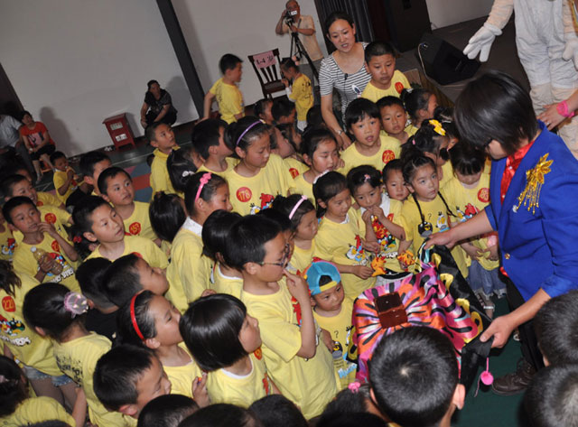 當小朋友們還沒有從魔術的神奇中回過神來,小丑哥哥的滑稽表演立即又吸引了孩子們的視線。小丑哥哥到臺上和大家一起玩《憤怒的小鳥》游戲,小丑哥哥滑稽的表演讓小朋友們哄堂大笑。彈射出的不僅是玩具娃娃,更給小朋友們送去了快樂和幸福。第四個是小游戲,《雙雙對對對》,讓小朋友們到舞臺上和卡通人物一起互動,孩子們圍成一個圓圈尋找伙伴,使陌生的孩子們擁抱在一起,尋找到友情,同時理解了團結就是力量。變臉大師把國粹變臉的絕活展現得淋漓盡致,整個表演一氣呵成。
