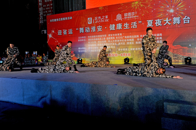 7月30日晚,淮安市公安局在體育館廣場舉辦“舞動淮安·健康生活”夏夜大舞臺市民健身活動公安專場演出。活動在激昂的鼓韻聲中拉開帷幕。總公司的精彩的擒敵表演、開場舞以及《當祖國召喚》等節目參加活動,贏得了現場市民的陣陣掌聲。活動中還進行了省十八屆運動會和健康生活知識有獎問答。市局黨委委員、機關黨委書記蘇必偉、總公司總經理婁伯翱等領導在現場觀看了演出。市交巡警支隊、特警支隊、總公司人防中心等100余人參加活動