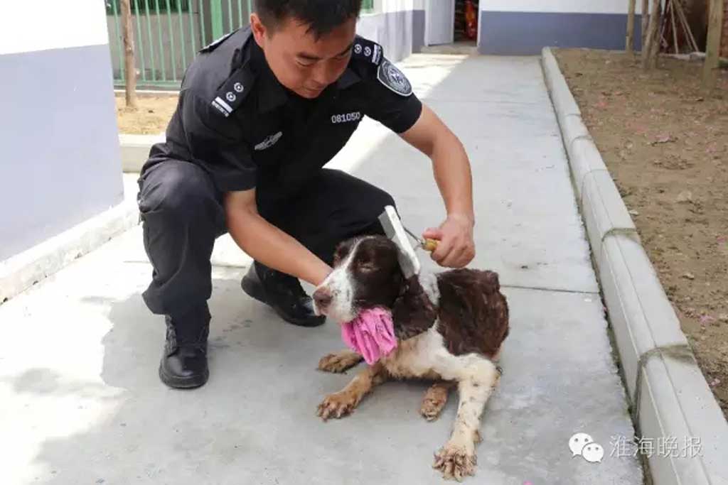 訓練結束,警犬回舍,趙亞峰帶著記者參觀起了犬舍。在一間犬舍前,趙亞峰停下了腳步,靜靜地看著里面的一只史賓格犬。不像剛才訓練的警犬,這只犬顯得慵懶,沒有精神,眼睛里居然還有不少眼眵。趙亞峰打開犬舍,將這只犬牽了出來,拿起一塊毛巾,用清水洗干凈,把犬溫軟地抱在懷里,輕輕地為它擦拭眼眵。洗干凈后,趙亞峰拿來一把梳子,為它梳理著毛發,犬閉著眼睛很享受。