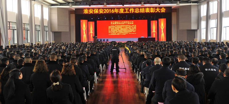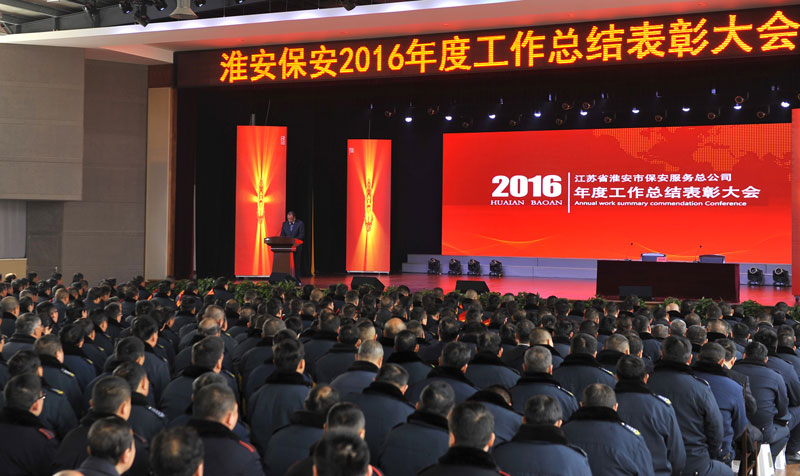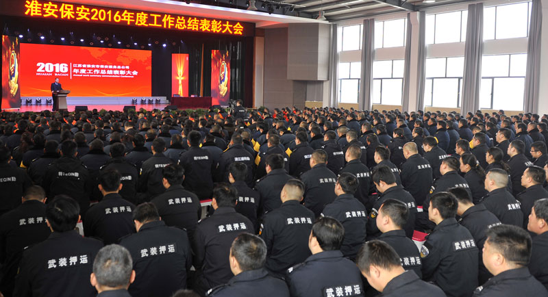 2017年2月26日上午,淮安保安服務總公司在活動中心召開了2016年度工作總結表彰大會,總公司保安隊伍分隊長以上骨干和保安員代表、押運隊伍市區押運員和駐各縣隊員代表、各分公司員工代表、行政中心各部門人員以及保安中專班學員共計近800人參加了會議。
