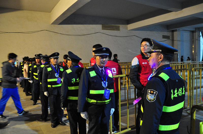 為做好安保工作,11月2日上午,人防中心專門組織參加臨沂安保人員進行專項培訓。3日上午7:00集合出發,提前到達臨沂大學,按照承辦方要求,現場搭建300米防爆墻,10個預檢票口通道,承擔了25000名觀眾入場的安檢、檢票通道的秩序維護等安保任務。