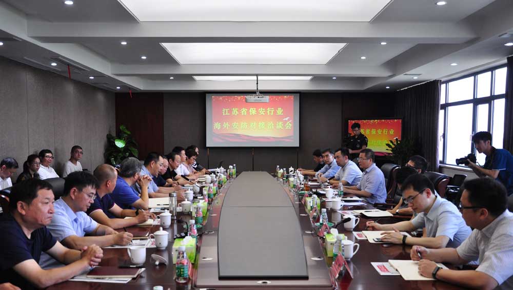 2018年8月7日上午,江蘇省保安協(xié)會邀請江蘇省商務廳、江蘇海外企業(yè)集團有限公司、江泰聯(lián)盟有關主管部門,組織淮安市保安服務總公司、南京市保安服務總公司、徐州精誠特衛(wèi)保安服務有限公司、江蘇英杰保安服務有限公司、江蘇世安保安服務有限公司、蘇州營財保安服務股份有限公司、云之約安全服務(江蘇)有限公司等重點企業(yè),在淮安市召開了江蘇省保安行業(yè)海外安防對接洽談會,建立了全省保安行業(yè)海外安防協(xié)作交流機制。