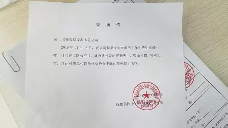 2019年5月1日,駐外分公司收到來自中國能源建設(shè)集團江蘇省電力設(shè)計院有限公司發(fā)來的表揚信,感謝淮安保安駐江蘇省電力設(shè)計院有限公司隊員汪瑩在4月28日的保潔工作中拾金不昧,撿到鉆戒后立即向隊長匯報,駐點隊長及時通報客戶單位并采取相應(yīng)措施聯(lián)系到失主,歸還失物。失主非常感謝汪瑩,客戶單位對淮安保安派駐的保潔員汪瑩同志拾金不昧的精神提出了表揚,對淮安保安進駐后的工作也表示認可!