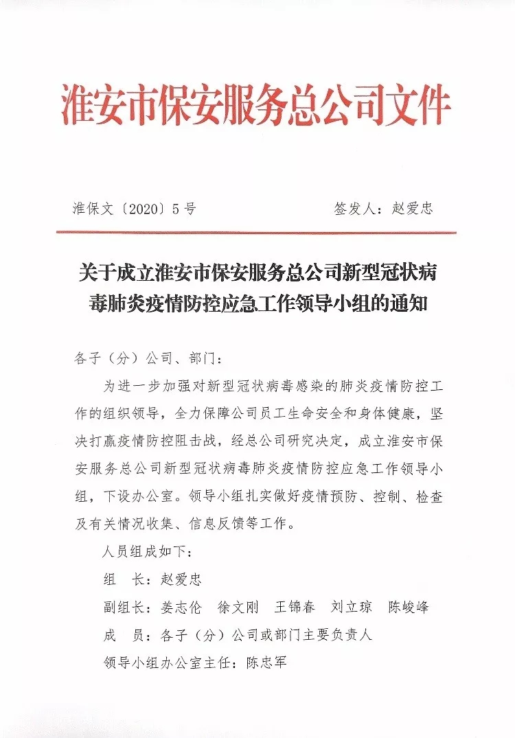 疫情就是命令,防控就是責任。總公司黨總支積極應對,超前部署,1月26日,總公司制定并下發《淮安市保安服務總公司新型冠狀病毒感染的肺炎疫情防控應急預案》、《關于成立新型冠狀病毒感染的肺炎疫情防控應急工作領導小組的通知》、《致全體黨員的一封公開信》。春節期間,總公司黨總支書記、總經理趙愛忠等領導班子多次深入基層督導疫情防控工作。總公司利用微信群、工作群對疫情防范工作進行再部署、再安排、再要求,要求各級管理人員要把疫情防控作為當前最大的政治任務,切實履職擔責,認真抓好疫情防控工作,做到全員宣傳到位、措施到位、防范到位。