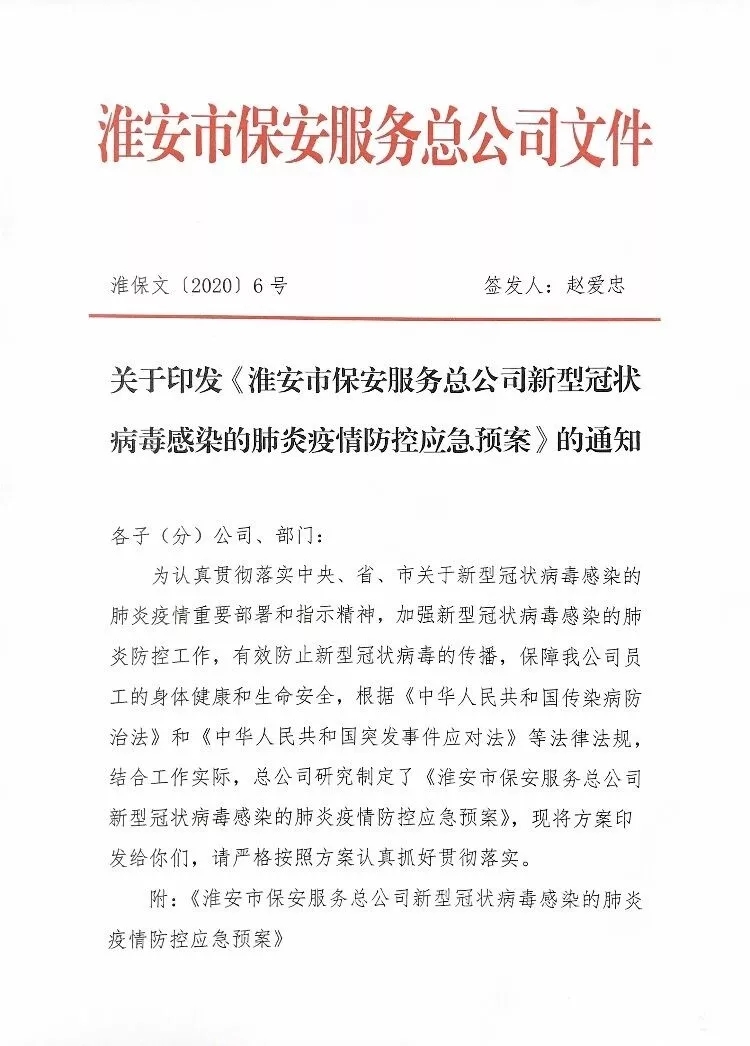 截止目前,淮安保安沒有發現一名員工感染新型冠狀病毒,疫情得到了有效防控。