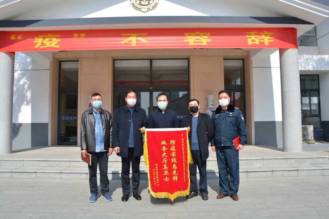 3月17日上午,淮安市行政審批局副局長丁永祥,辦公室主任劉亞明專程來到總公司對在疫情期間派駐在政務中心的保安員們辛勤付出送上錦旗和感謝信,總公司副總經(jīng)理王錦春陪同。