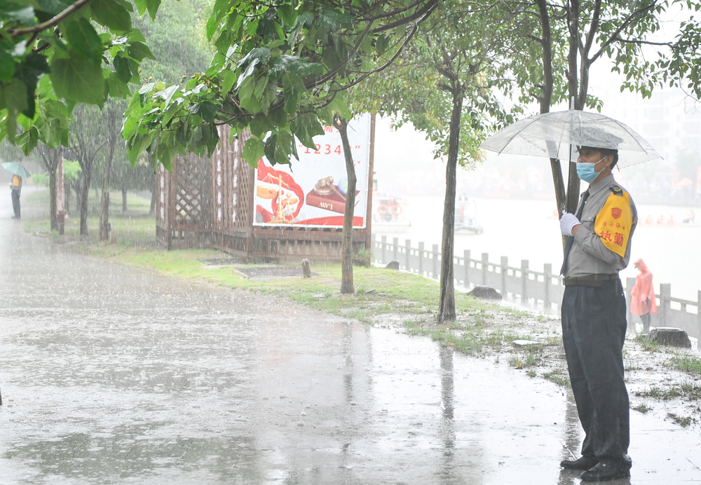 23日清晨6時,總公司抽調(diào)600余名保安人員按照方案提前布崗到位,在風(fēng)雨中形成一道堅(jiān)實(shí)的人形屏障風(fēng)景線。面對肆虐的風(fēng)雨,執(zhí)行現(xiàn)場安保任務(wù)的隊(duì)員們始終堅(jiān)守在崗位上,有序開展安全檢查、體溫檢測、沿途守護(hù)、維持賽場秩序,一方面繼續(xù)抓牢抓實(shí)疫情防控,一方面認(rèn)真做好各項(xiàng)安保工作,精心保障賽事活動安全、有序開展。