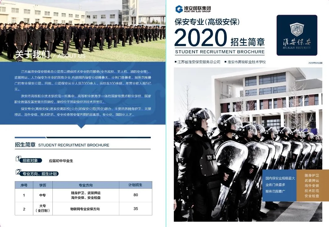 本屆高級安保專業,在原有三年制中專班基礎之上,新增了五年制“物聯網方向高級安保”大專班。公司黨總支書記、總經理趙愛忠對專業招生工作高度重視,多次強調招生工作的重要性。公司制定了詳細的招生宣傳工作方案,精心制作了招生宣傳手冊、招生宣傳片,通過中國保安微信號、淮安公安微警務、保安總公司微信號、抖音號等媒介加強招生宣傳,公司人防中心、押運中心等部門組織招生工作小組深入區縣中學畢業班宣講,吸引了大批考生踴躍報考。